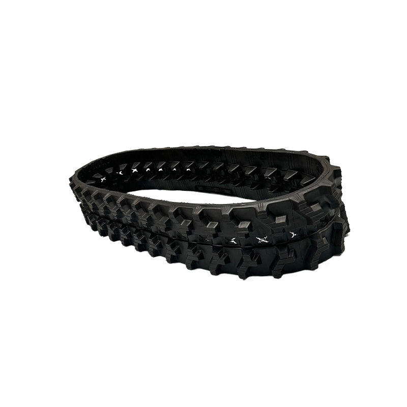 橡胶轨道由金属变速箱轴承部分,强层牵引部件和弹性橡胶部分组成。从外部到内部,它通常包括橡胶机身,图案层,缓冲层,强层和核心金和其他部分。其中,橡胶体提供了轨道的弹性和灵活性。图案层增加了与地面的摩擦和粘附,并改善了防滑性能。缓冲层可以在驾驶过程中吸收振动和冲击。坚固的层通常由高强度纤维或钢丝组成,其主要具有牵引力和负载的力。核心金是轨道的骨骼,通常是金属材料,用于连接和修复各个部分,从而增强了轨道的整体强度。